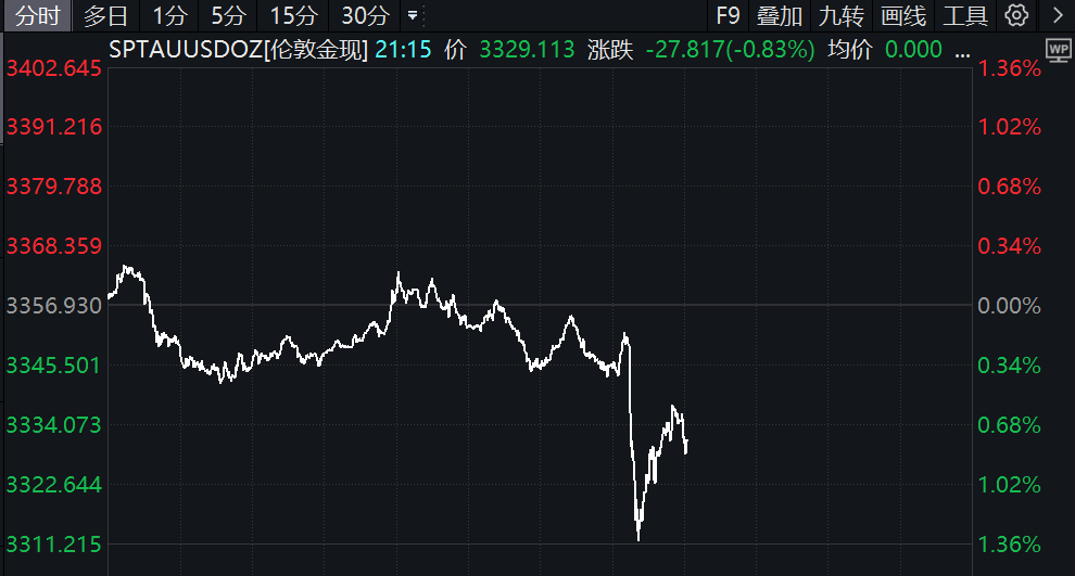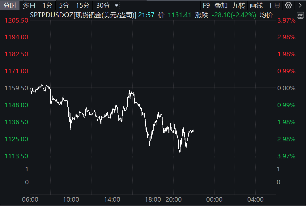现货黄金短线跳水,现货钯金大跌。