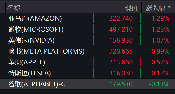 美国七巨头除谷歌外其余个股均飘红。