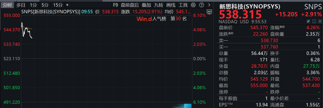芯片设计软件股新思科技一度涨近6%。