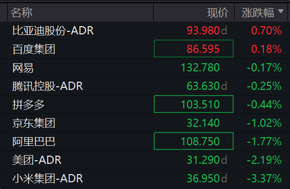 中概科技龙头表现较弱。截至发稿,小米集团跌超3%,美团跌超2%,阿里巴巴、京东集团均跌超1%。